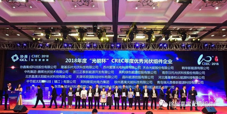 10月31日,由中國(無錫)國際新能源大會暨展覽會CREC、Solarbe索比光伏網、《光能》雜志共同主辦的2018CREC光能杯光伏行業頒獎晚會盛大召開,徐州嘉寓光能榮獲“年度優秀組件企業大獎”。