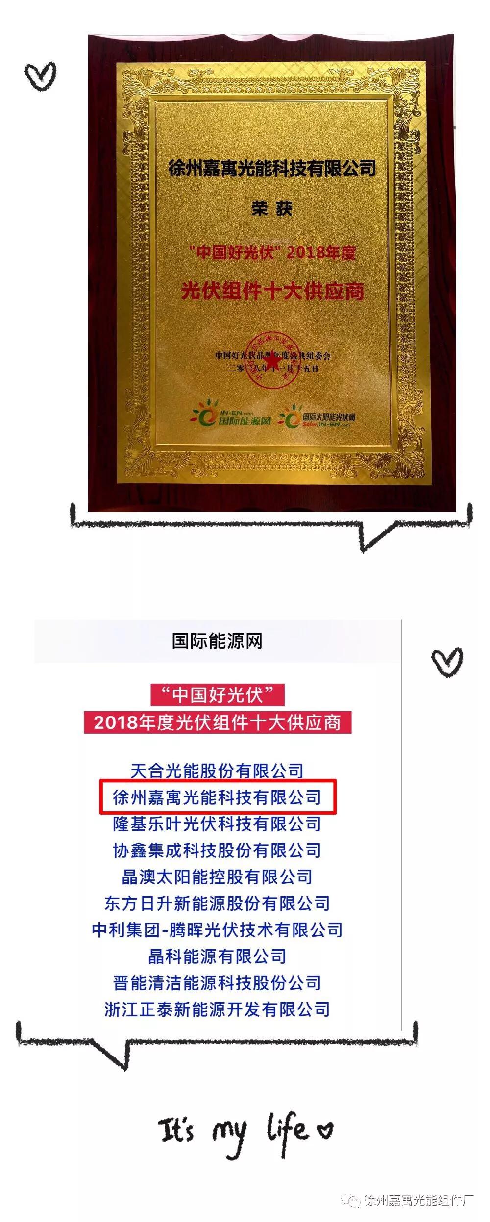 嘉寓光能在中國好光伏評選中再度斬獲光伏組件十大供應商以及年度新銳企業